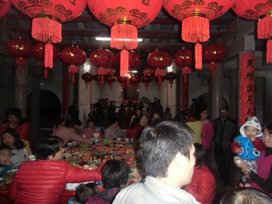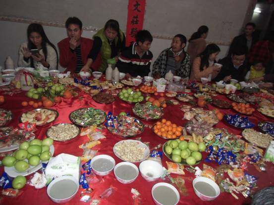 這個時候最熱鬧的莫過于祠堂里面了,因為這是公眾場所,人們都喜歡把食物拿到這里擺放可以方便人們,于是,祠堂里面就會更加具有節日的氣氛——男人們會大聲地喝酒,高聲地吆喝;婦女們會討論自己的家事、別人的家事、暢談今年的發展和去年的收入等,最開心的莫非過于是孩子們了,他們笑著、追逐著、圍在糖果的桌子周圍跑來跑去,吃著村民提供的免費糖果,談論著誰家的糖準備得多且好吃。也有些婦女會在悄悄地議論著誰家的茶擂得好。