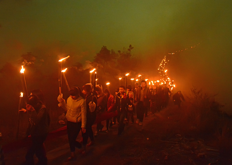 支支火把匯集成一條巨大的火龍”牽龍”隊伍沿著蜿蜒的山路而下,場而壯觀。(圖:羅兆安 文:洪廣憑 彭偉君 羅新煥)